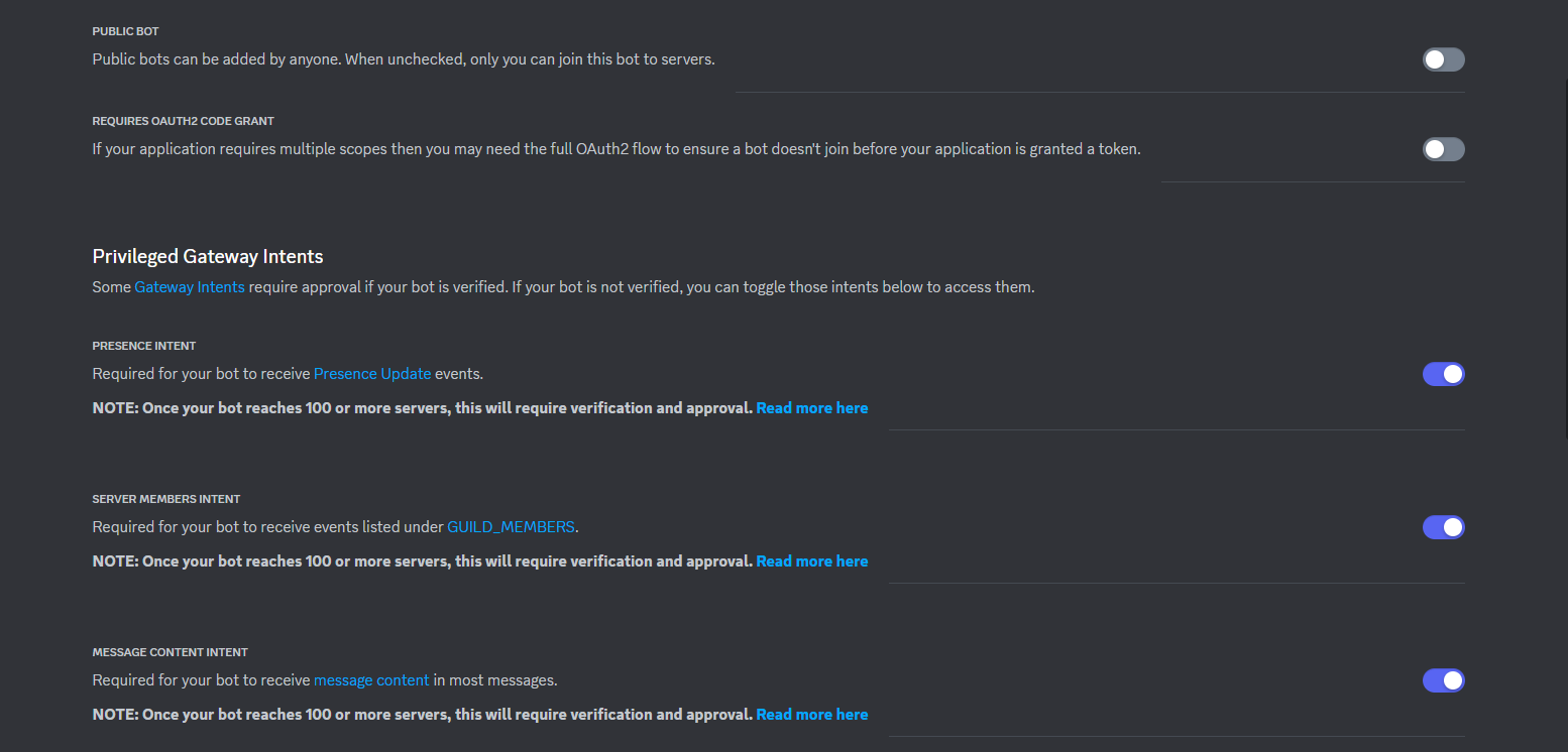 Akzeptiere alle Priviliged Gateway Intents => Presence Intent -> Server Members Intent -> Message Content Intent und Save Changes