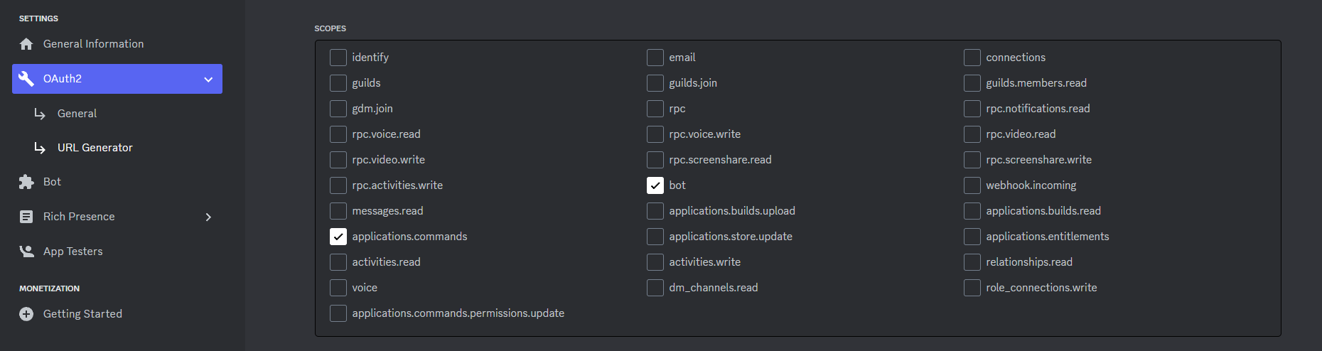 Gehen sie zu OAuth2 -> URL Generator . unter Scopes wähle bot . unter Permissions wähle Administrator . Anschließend kopieren Sie die URL unten und fügen sie in die Suchleiste Ihres Browsers ein, wählen den Server aus und bestätigen.